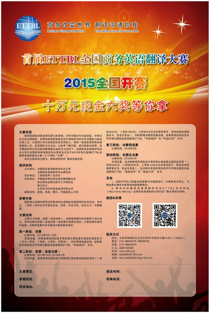 首届全国商务英语翻译大赛(ETTBL)由全国商务英语翻译考试办公室、全国商务英语翻译专业委员会主办的全国性商务英语赛事。比赛分三个阶段:校级初赛、省级复赛、全国决赛预选赛和总决赛。总决赛设一等奖、二等奖、三等奖、优秀奖若干,获奖者将颁发荣誉证书、奖金及奖品。为备战省级复赛及全国决赛,365完美决定举办2015年首届全国商务英语翻译大赛(ETTBL)初赛。现就比赛相关情况说明如下: