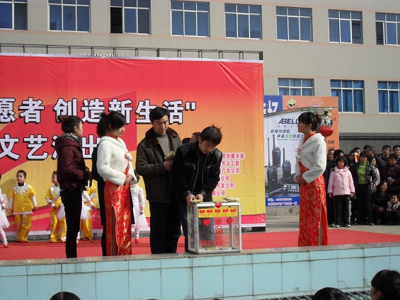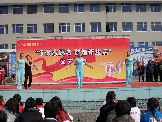 2009年12月5日是第24个国际志愿者日,为倡导志愿服务精神,帮助残疾弱势群体,由共青团安康市委、安康市双创办主办的以“争做志愿者,创造新生活”为主题的宣传义演活动在中心广场举行。安康市各行各业的志愿者们齐聚会场宣传志愿服务精神,募捐爱心物资。外语系志愿者服务队受邀参加了本次活动。