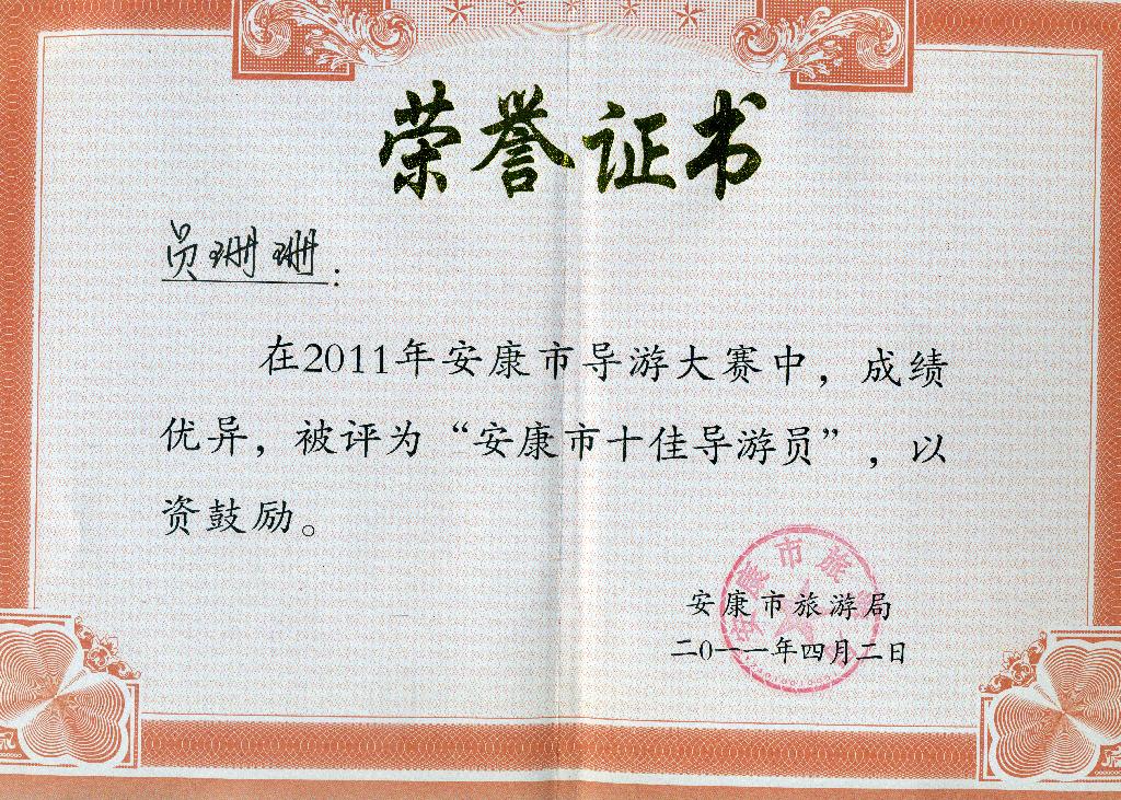 由安康市旅游局主办,安康市双创办、安康市文广局协办的安康市“首届导游大赛”决赛4月2日圆满落幕。通过现场自我介绍,景点介绍、知识问答,才艺表演等多轮激烈角逐,我院外语系旅游英语专业08级郧珊珊同学脱颖而出,荣获“安康市十佳导游员”称号。