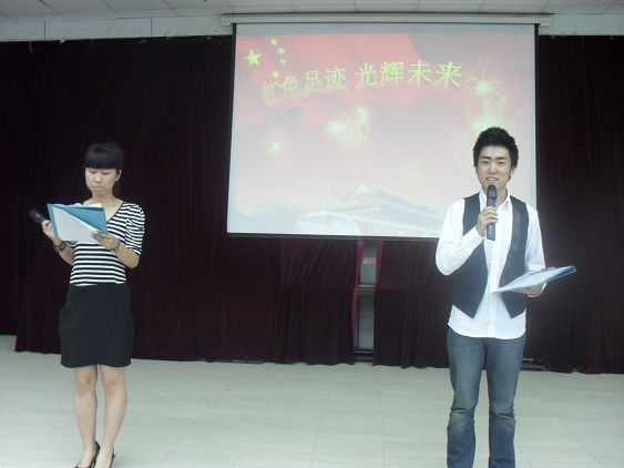 为迎接中国共产党九十岁华诞,歌颂党的伟大成就,增强同学们爱党爱国之情,提高当代大学生的政治觉悟,丰富学生的课余文化生活,5月8日晚,由学院团委主办,外语系和教科系承办的”红色足迹,光辉未来”诗歌朗诵大赛决赛在图书馆六楼报告厅举行. 学院团委书记鲁延安、学工部副部长郑武生、教科系党总支书记王辉、外语系党总支书记李岩出席朗诵活动.