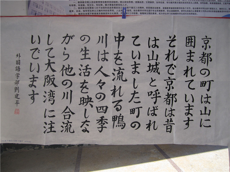 此次比赛共收到来自全校的五十多幅日语软、硬笔书法作品。由日语外籍教师赤松秀夫先生、日语专业教师张琴芳及院秘书科科长卢伟老师组成的评委组,对参赛作品进行了认真评选。最终,日语专业09级学生刘建平同学脱颖而出,在此次活动中以良好的软、硬笔书法表现获得第一名。