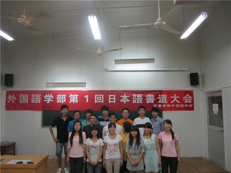 为进一步丰富外语系日语专业学生第二课堂,提高日语专业学生的书写能力,同时激发全院广大日语学习者的学习兴趣,为他们提供展现自我的舞台,5月26日,外语系成功举办了“安康学院首届日语书法大赛”。 5月26日晚7:30在6408教室,举行了颁奖仪式。外语系党总支书记李岩老师、日语外籍教师赤松秀夫先生,应邀出席颁奖仪式。