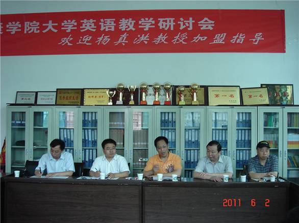 在杨真洪教授加盟我系并驻校讲学之际,由外语系(大学英语教学部)和教务处共同组织的 “大学英语教学研讨会” 于6月2日下午在体育馆一楼会议室举行。我院兼职教授杨真洪、教务处副处长权大学、外语系主任哈红光、大学英语教学部主任李继平、各教研室主任和大学英语教学部教师骨干参加。