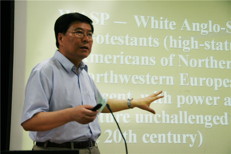 杜教授的学术背景和他多年的教学经历,使他在英语语言文化研究领域有着丰富的学术建树,杜教授从“大熔炉”和“色拉盘”的区别谈起,用亲身经历和国外典型事例,深刻剖析剖析了“多元文化主义”的内涵,与此同时,杜教授还就如何看待美国“多元文化主义”阐述了自己独到的见解,让在场师生获益匪浅。杜教授风趣幽默,充满激情,长达一个半的报告赢得了全场师生热烈掌声,在师生互动时,他耐心细致地回答同学们提出的问题,他谦虚的学者风范和富有见地的回答,赢得了师生们的热烈欢迎和好评。