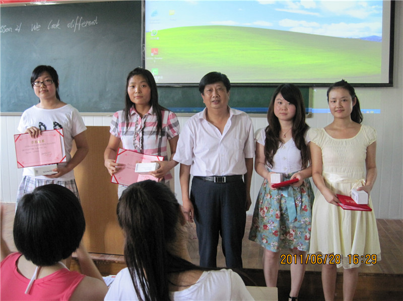 2009级英语教育专业刘梦娜,刘玲,王培艳,常灵梅同学为英语教育09级,10级学生做了精彩的示范教学,他们新颖的教学设计,流利的课堂语言,精美的教具,赢得了师生的一致好评。10级学生代表王霞和特邀教师代表鲁克伟分别对四位同学的教学做了点评。外语系副主任黄章成为他们颁发了纪念品和荣誉证书。