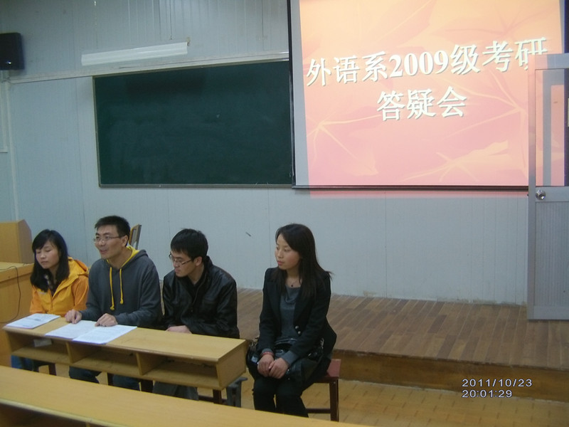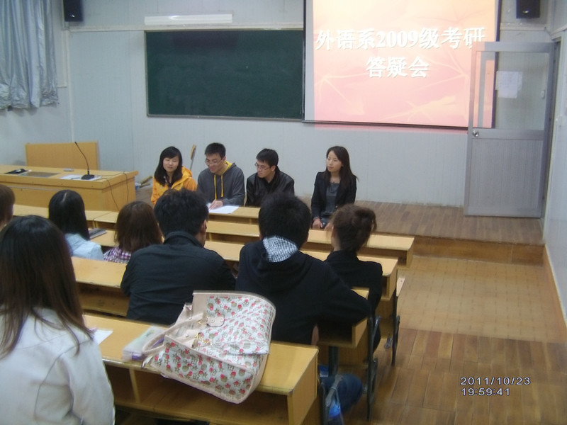 为更好地指导我系学生考研, 为他们提供考研策略,2011年10月23日晚上,在6405教室,外语系举办了2013届考研答疑会。外语系鲁克伟、代媛、高亮、刘婷四位教师以及09级本科生参加了答疑会。