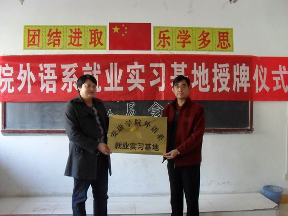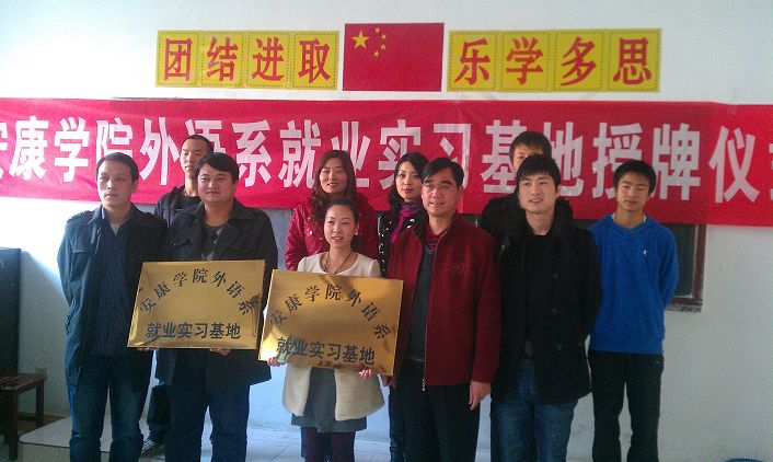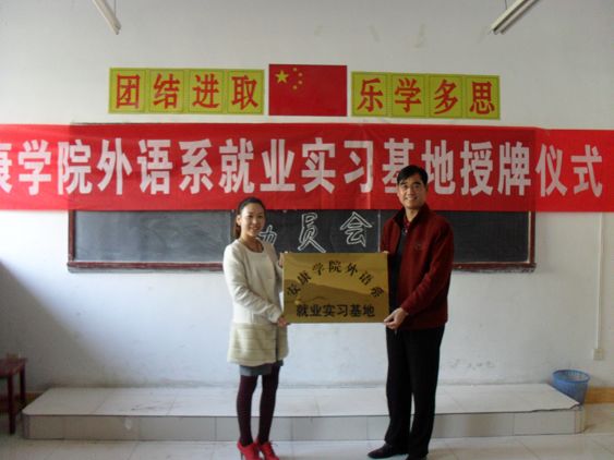 为促进我系学生的实习就业工作,我系邀请汉中、安康等地的英语学校参加我系的专场招聘会,并与他们就毕业生实习、就业等进行了交流,并在岚皋阳光英语学校、石泉蒲公英英语学校两家单位设立安康学院外语系就业实习基地。11月19日下午,在外语系专场招聘会上,系党总支书记李岩给两家单位进行了授牌仪式。
