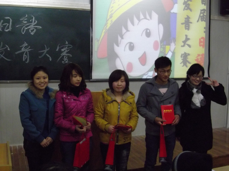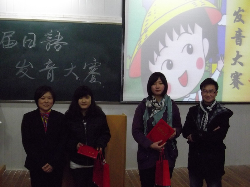 为了培养我系日语专业大一学生的学习兴趣,锻炼和提高他们的日语发音和口语表达能力,在系领导的关怀和指导下,在日语专业雷娟红老师和学生的精心策划和准备下,我系于12月13日晚上在6406教室举办了“首届日语发音比赛”。参加本次比赛的选手皆为大一日语专业新生,日语专业教师赤松秀夫、张琴芳、陈玉平、雷娟红、肖雯、刘婷作为评委出席了本次比赛。另外本专业大二、大三的部分同学也参与了这次活动。