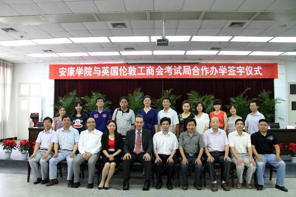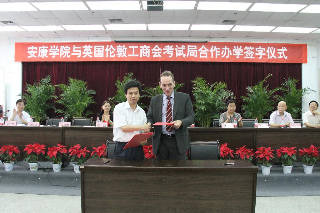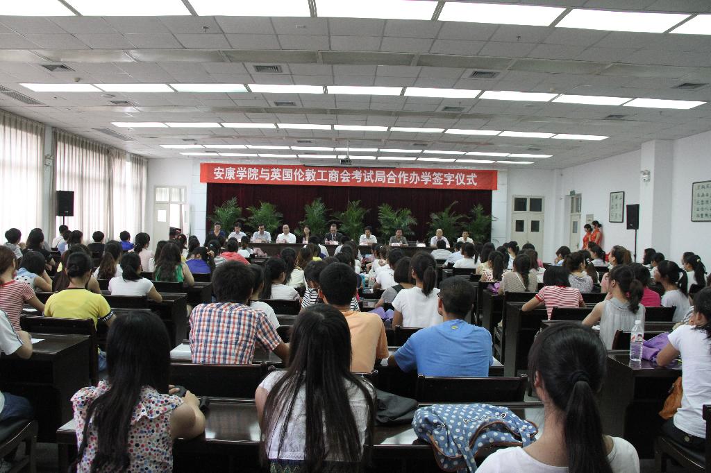 6月19日下午,安康学院与英国伦敦工商会考试局LCCI合作办学签字仪式在365完美图书馆六楼报告厅隆重举行。LCCI亚洲区总裁 Mark Disney、LCCI中国市场发展中心总经理颜洁女士、副总经温来纲先生、安康学院副校长陈刚教授、教务处处长钟生海、就业处处长丁义国、外语系主任哈红光教授、外语系党支部书记李延福以及外语系部分师生代表参加了签字仪式。会议由外语系副主任张哲华主持。