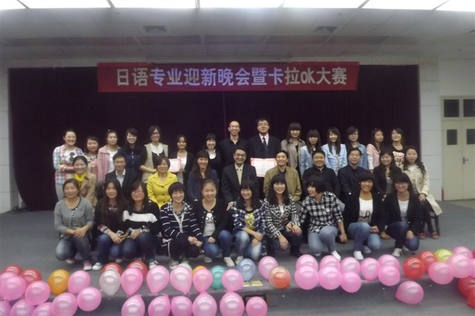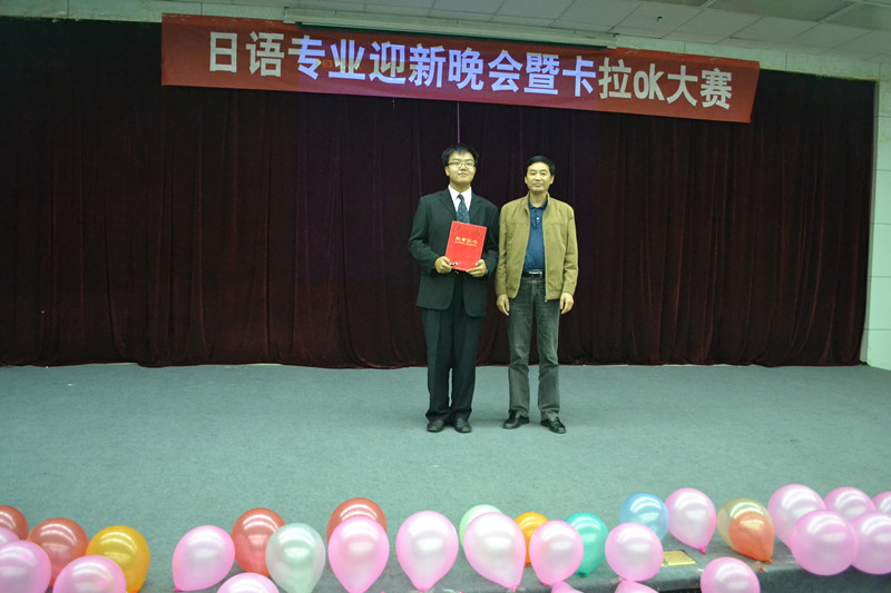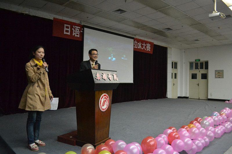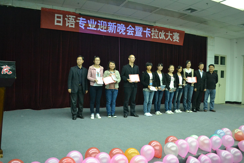 10月17日晚,外语系日语教研室在学校图书馆六楼报告厅成功举办了“日语专业迎新晚会暨卡拉OK大赛”。外语系哈红光主任,党总支李延福书记,张哲华副主任老师,大英部李继平主任,12级日语专业辅导员杨厚东老师以及日语专业全体学生参加了本次活动。日语专业教师陈玉平,张琴芳,肖雯,刘婷,梁维,以及外教赤松秀夫和海道千春担任大赛评委。