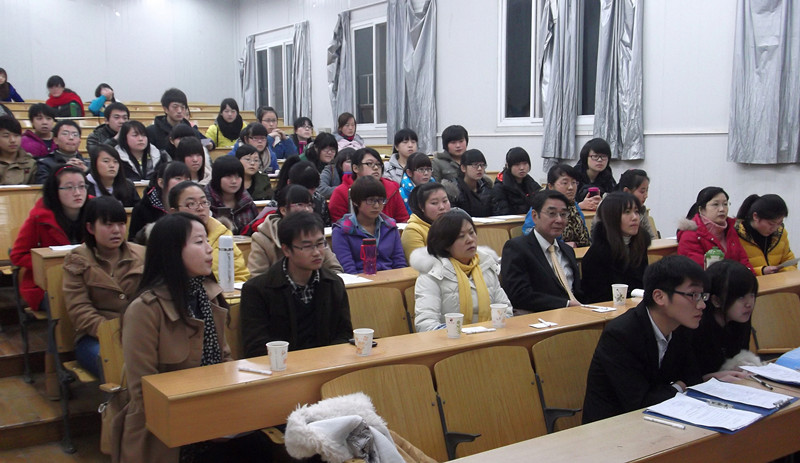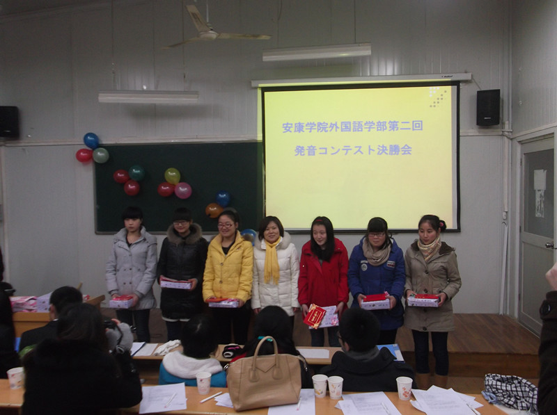 为了培养日语专业新生的学习兴趣,锻炼和提高他们的基础日语发音和口语表达能力, 12月21日晚上,日语教研室在6407和6408教室举办了第二届日语发音比赛。参加本次比赛的选手皆为大一日语专业新生,日语专业教师赤松秀夫、海道千春、张琴芳、陈玉平、雷娟红、肖雯、刘婷、梁维作为评委出席了本次比赛。另外本专业大二、大三的部分同学也参与了这次活动。