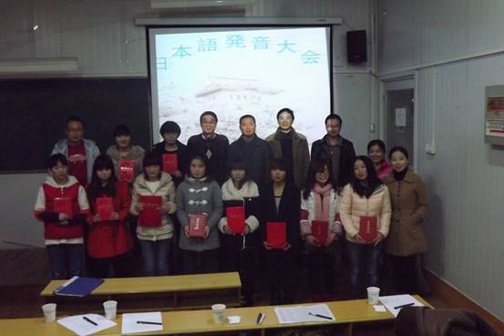为了培养日语专业新生的学习兴趣,锻炼和提高日语发音和口语表达能力, 12月16日晚,日语教研室在6405教室举办了第三届日语发音比赛。参加本次比赛的选手为日语专业一年级全体同学,莅临本次大赛的嘉宾有组织部胡波部长、外语系李延福书记,评委老师为日语专业赤松秀夫、陈玉平、刘婷、梁维、王庚老师。另外本专业大二、大三的部分同学也参与了本次活动。