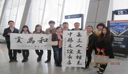 为落实2013年6月29日省委书记赵正永在西安会见来陕访问的韩国总统朴槿惠一行时的讲话精神,进一步推动双方人文教育交流与合作,陕西省教育厅将组派我省100名优秀大学生于2013年10月27日至11月1日参加由韩国教育部、庆尚北道政府、联合国教科文组织亚太总部在韩国庆州市、安东市共同主办的“通过人文相见-韩中青年论坛”。经过选拔,我系吴琼、刘佳妮、陶适意三名同学与各系学生一同前往与会。