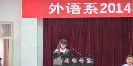毕业生代表---英语专业2010级李琪同学发表了热情洋溢的毕业感言,她简要回顾了大学的朝夕相处、同窗情谊、耕耘收获,并表示将牢记领导和老师们的殷殷嘱托,不负母校的殷切期望,不忘“笃学、尚行、厉志、创新”的校训,以饱满的热情和昂扬的斗志投身社会、服务人民、奉献青春、实现价值、回馈母校。她也代表全体毕业生祝福老师们身体安康,桃李芬芳,祝愿母校人才辈出,蒸蒸日上!