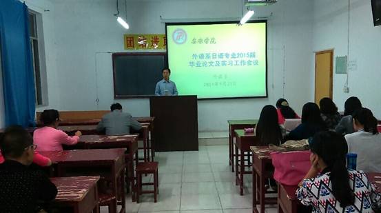 会上,张主任首先通报了2014届毕业论文工作情况,重点指出存在的问题,希望15届学生加以重视,然后对2015届毕业论文进行了布置。随后,张主任介绍了上周赴西安签订实习基地协议的情况,对日语专业学生集体赴中盈蓝海集团实习事宜作了安排,并嘱托同学们珍惜这次来之不易的机会,努力完成实习任务,为校企合作奠定良好的合作基础。