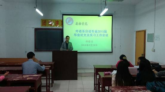 9月28日晚,外语系在6309召开了2015届日语专业学生毕业论文暨实习工作动员会议,外语系副主任张哲华,日语专业教师和2011级学生出席了本次会议,会议由日语教研室主任陈玉平老师主持。