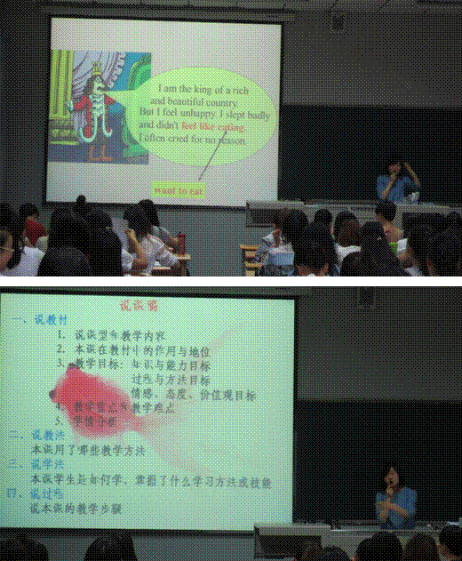 随后,胡镕老师以人教版八年级下册一个完整单元为例,详细向同学们介绍了课时划分,各课时的课型及其操作流程与注意事项。根据不同课型,胡老师将自己参加赛教的经典课例展示给大家,她独具匠心的PPT课件给在场的师生留下了深刻印象和思考。