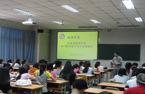 为确保即将开展的英语专业方向分流工作顺利进行,使学生对专业方向选择有更清楚的认识,6月12日下午4点30分,外语系在1014教室召开了2014级英语专业学生专业方向分流答疑会。系副主任张哲华、英语教研室主任兼翻译方向负责人王刚、教师教育团队负责人覃春晖和王欢参加了会议。