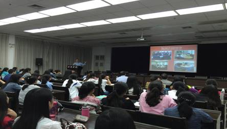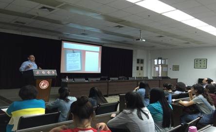 讲座伊始,Evan Frendo先生从“什么是商务英语”这一主题开始,就教师,测试机构,以及学生各个角色从不同角度来阐述和总结不同的观点。根据中国高等院校、语言学校、企业内部培训等机构的商务英语教学现状提出运用不同的教学方法。报告还针对高等院校从事英语语言教学的教师就如何建立国际商务交流意识以及掌握相应的应对策略,如何开展课堂教学,利用各种资源,帮助和培养学生的商务意识、商务理念和商务技能,最终在未来的工作中娴熟的开展商务交流。同学们通过提问,与美国教授进行了热烈交流,在交流中大家深刻感受到了当今社会发展形势下商务英语应用的迫切性。