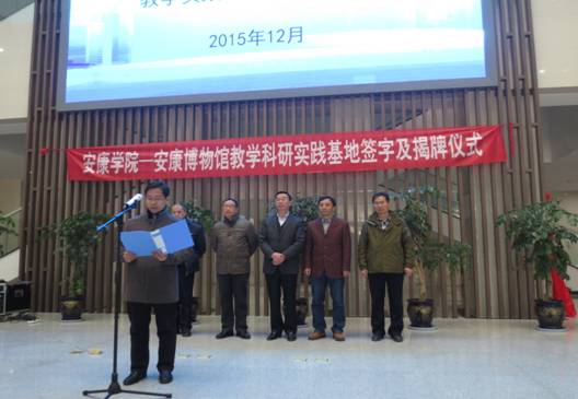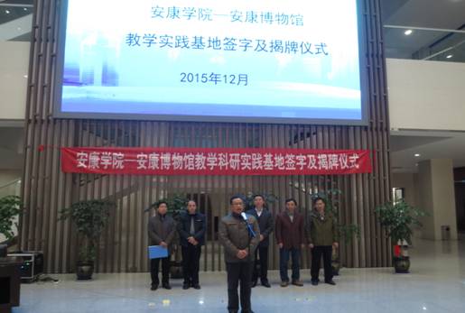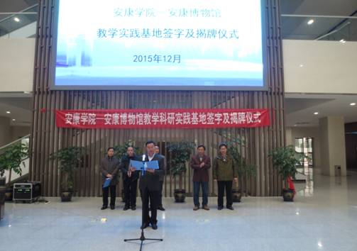 安康市文广局副局长陈义润首先致辞,对安康学院教学科研实践基地落户安康博物馆表示祝贺,他指出,此次校地合作,是安康文博界和教育界的好事、喜事,有利于馆院双方发挥各自的资源优势,深化多领域合作,实现优势互补、互惠互利、合作共赢,推动地方文化事业发展。希望安康博物馆要以“文化引领发展、文化服务人民”为已任,不断提高服务水平和质量,向不同类型、层次的观众提供优质的文化服务。