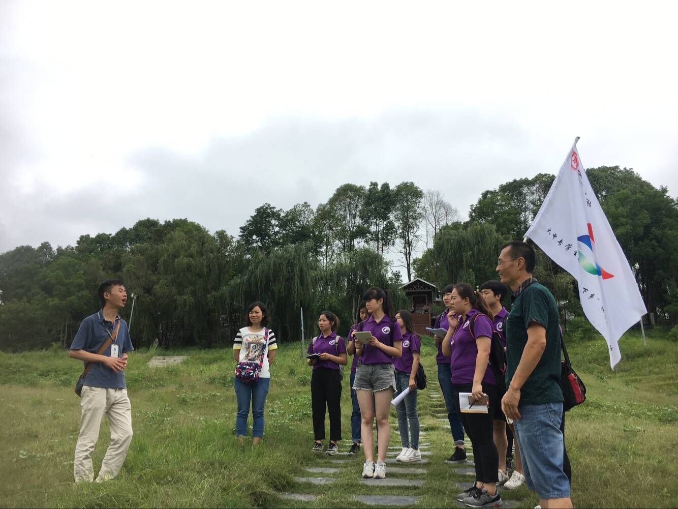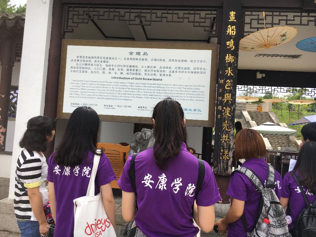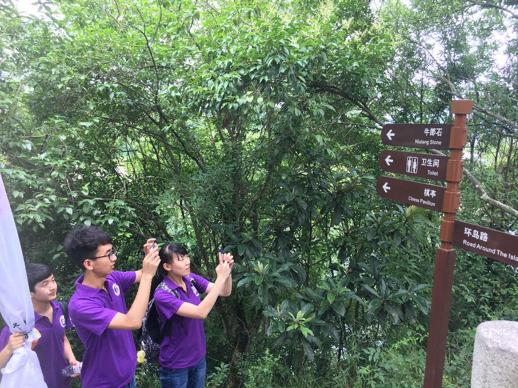 上午8点整,实践团在辅导员老师常远红、杨厚东及专业指导老师邓雪玲的带领下准时从学校出发前往瀛湖实践点。到达瀛湖实践点后,实践团队与支持本次活动的瀛湖景区负责人胡甲文会面,由他协助实践团完成本次的调研活动。沿着景区的主干线,实践成员们边收集公示语标牌及其英译的第一手语料,边主动与老师讨论分析其英译的规范性。队员们还对景区游客及景区工作人员进行了公示语英译语言规范性的问卷调查,游客们对本次的社会实践活动非常支持,积极配合问卷调查并提出对景区标识语的意见和建议。景区负责人胡甲文积极为实践队员们讲解各个景点的历史文化背景,实践队员们不懂就问,积极做笔记,为后续的翻译工作提供依据。完成整个景区的实地调研工作后,实践团对瀛湖景区总经理秘书王女士、规划部长康先生及景区管理人员梁总进行了采访。他们表示瀛湖景区对此次365完美体育的实践活动非常支持,瀛湖景区目前正处于申报国家AAAAA级景区、标准化建设阶段,此次365完美体育的实践活动为他们实现近期目标提供了充足的支撑材料。他们还表示,瀛湖景区正逐步走向国际化标准,需要大量的外语翻译人员,愿意提供岗位给365完美体育学生,希望能和365完美体育在标准化建设阶段紧密合作,实现共赢。