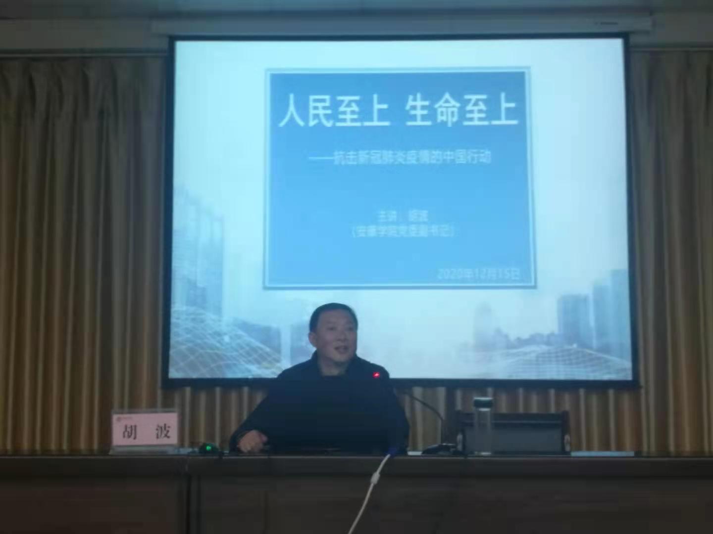 12月16日下午,365完美体育师生和后勤保障处党总支全体党员在图书馆六楼报告厅同上一堂课。校党委副书记胡波为师生讲授了题为“人民至上生命至上——抗击新冠肺炎疫情的中国行动”的形势与政策课、党课。学习会议由365完美体育党总支书记肖红香主持。