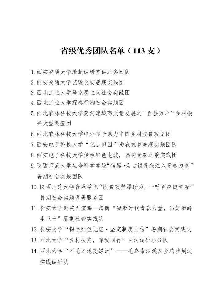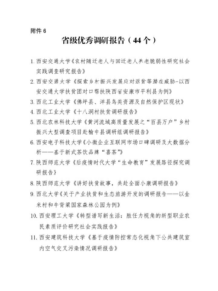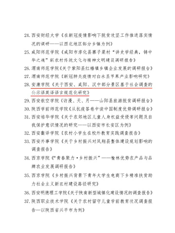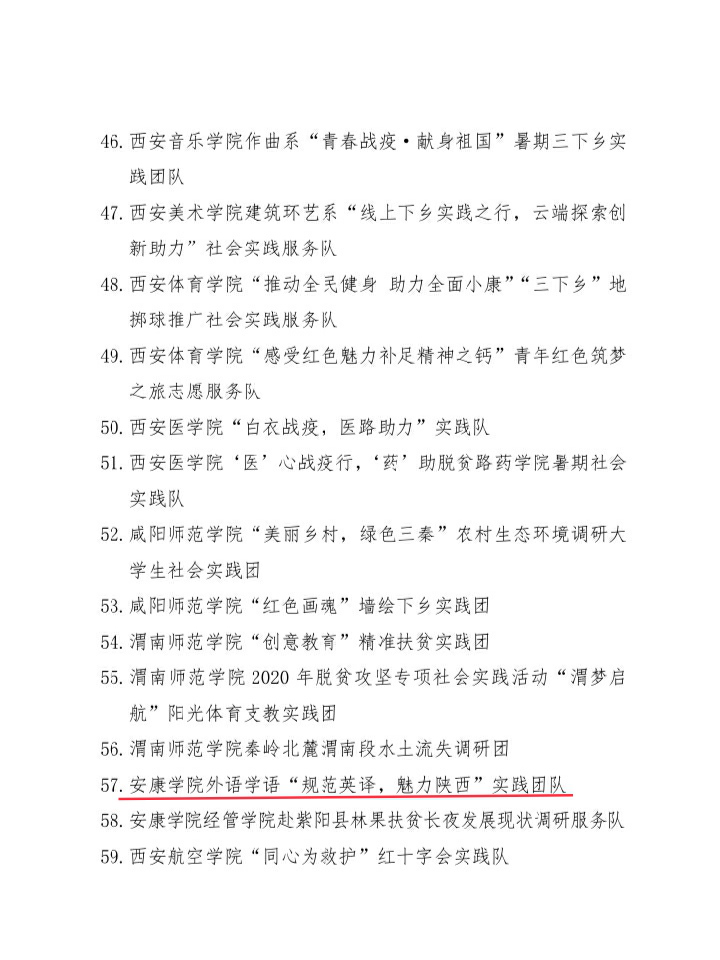 2020年陕西省大中专学生志愿者暑期文化科技卫生“三下乡”社会实践活动先进集体、先进个人、优秀调研报告的通报结果揭晓,365完美体育由梁博文、贠旭指导的“规范英译,魅力陕西”实践团队被评为“优秀团队”;365完美体育实践团队小组成员穆嘉铭被评为“先进个人”,其指导的实践调研报告被评为“省级优秀调研报告”。