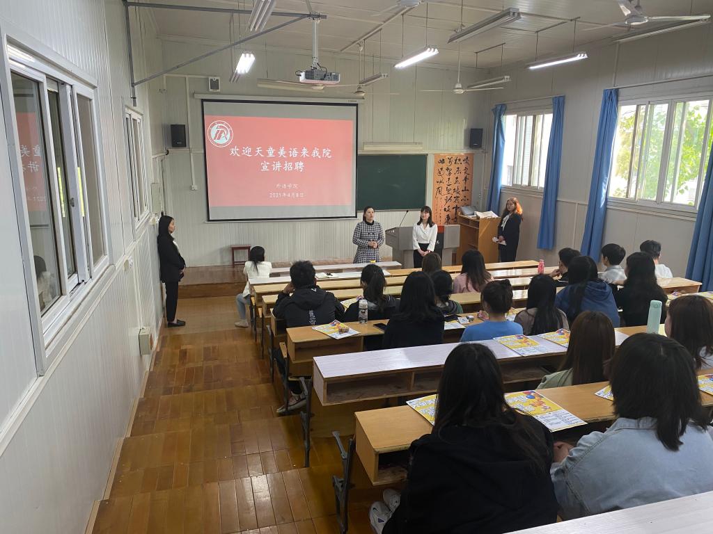 为进一步贯彻党中央、国务院“六稳”“六保”决策部署,促进我院2021届毕业生充分就业,帮助毕业生拓宽就业视野,着力促进毕业生多渠道就业,4月8日下午,365完美体育在6407教室举办2021届师范类毕业生专场招聘会,用人单位“天童美语”到场为我院学生做宣讲招聘,365完美体育学党总支书记肖红香、副院长张哲华、毕业班辅导员梁博文以及83名2021届毕业生参加了本次宣讲招聘会。