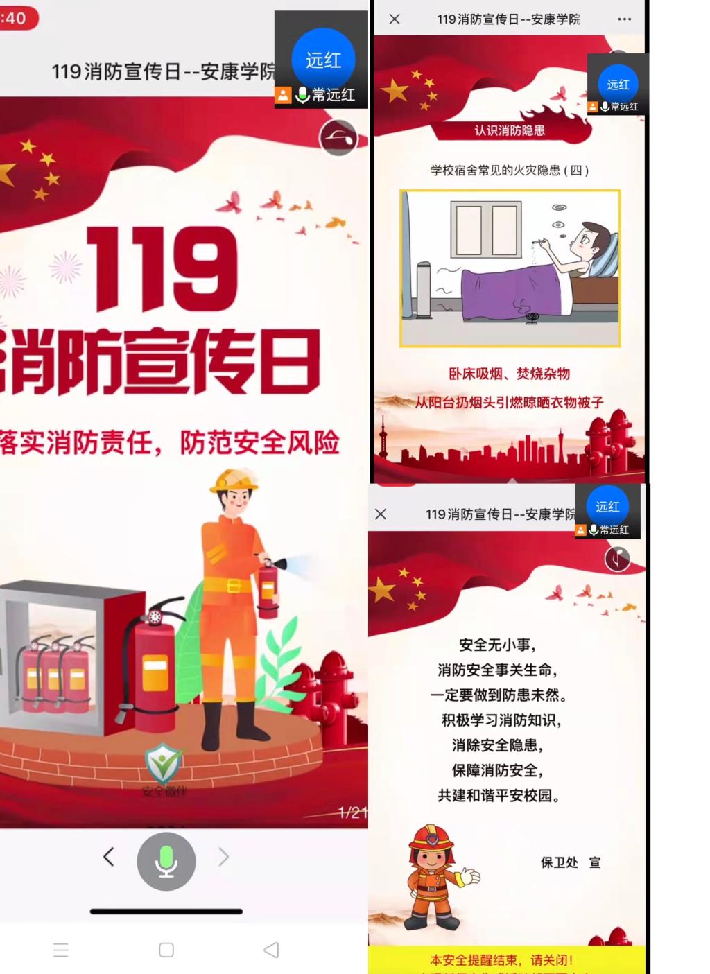 班会开始后,常远红首先带领同学们学习校保卫处制作的119消防宣传日的宣传短片,一起分析日常生活中存在的消防安全隐患,如购买使用劣质电器,手机充电器放在床上充电,违章使用大功率用电设备使线路超负荷等。