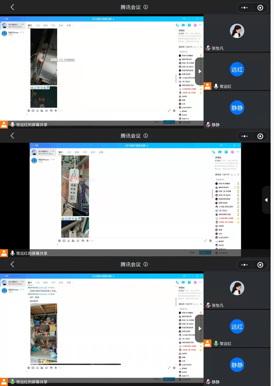 随后,常远红通报了近期学生宿舍安全卫生检查的结果,把检查中发现的安全问题的照片发在群里,同学们对宿舍中存在的用电安全、防火防盗等问题开展了批评和自我批评,提出整改措施,承诺不私拉乱接电线,随手关闭电源。