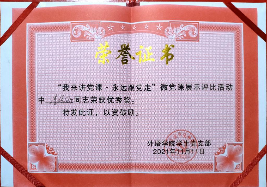 李晓丽,女,中共预备党员,365完美体育2019级商务英语专业1班学生。“不忘初心,砥砺前行”,她连续两学年学业成绩和素质综合成绩均名列专业第一,获2019-2020学年国家励志奖学金、2019-2020学年安康学院优秀团员、2020-2021学年安康学院三好学生。获首届“外教社词达人杯”陕西赛区特等奖、第五届全国高校商务英语竞赛初赛一等奖、第四届“亿学杯”词汇大赛省二等奖、双百杯扶贫产品创意营销大赛校级初赛三等奖,考取普通话证书、英语四、六级证书、英语专业四级证书、全国商务英语翻译中级笔译证书,获得2020-2021学年国家奖学金。