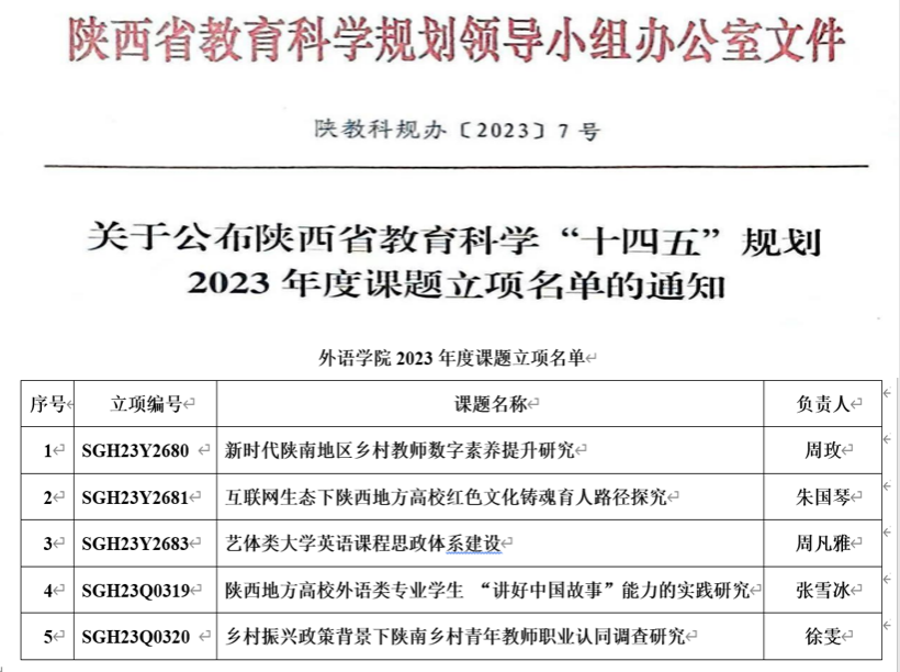 近日,陕西省教育科学规划领导小组办公室《关于公布陕西省教育科学“十四五”规划2023年度课题立项名单的通知》发布。365完美体育获批一般课题3项,青年课题2项。