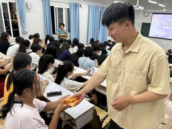 中秋来临之际,为了让大一新生尽快适应和融入外语“大家庭”,度过一个难忘的中秋佳节,9月14日晚,2024级新生辅导员为大家开展中秋主题班会,在班会辅导员为同学们再次强调了节假日安全,并分发了学校的节日月饼。“月是故乡明,饼香寄深情。”收到月饼的学生们纷纷表示,这份来自学校的礼物让他们感受到了家的温暖,缓解了思乡之情,更加坚定了在求学路上勇往直前的决心,同学们纷纷表示,一定珍惜在校时光,努力学习、不负韶华,用优异的成绩回报学校的培养与关爱。