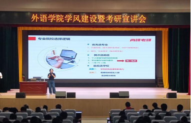 随后,刘丹结合专业最新动态,细致分析近年来考研政策变化、各学科报考及录取比例等关键信息,讲解了初试、复试调剂关键环节的注意事项,让同学们对考研大环境有清楚认知。在“专业院校选择”环节,针对外语学科特点,梳理了陕西省重点院校外国语言文学、翻译硕士等专业的招生情况、报录比,指导学生如何精准匹配目标院校,并强调优先选专业、其次选地区、最后选学校的择校逻辑。在“高效复习规划”板块,分享各学科高效复习方法与时间安排策略,强调合理规划对备考的重要性。