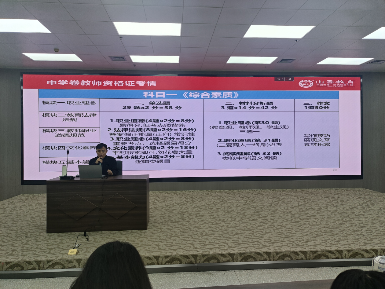 随后,山香教育赵海申老师围绕“大学生毕业就业形势分析”“备考建议”“教师资格证考情分析”“高分备考策略指点”四大模块展开系统讲解。他从报考条件、学历要求等基础信息切入,为不同年级师范生梳理了分阶段报考时间规划,明确本科阶段各关键备考节点,结合历年考情总结实用记忆口诀、题型解题规律及备考资料选择建议,通过具体案例演示答题思路,帮助同学们搭建系统化备考框架,精准破解备考重难点问题。整场讲座内容详实、案例鲜活、指导性强,现场互动氛围热烈,同学们纷纷表示收获颇丰。