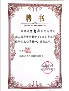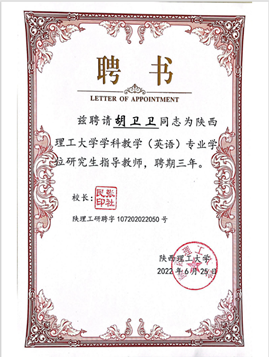 6月25日,我院两名副教授张哲华、胡卫卫受聘为陕西理工大学学科教学(英语)专业研究生指导教师,聘期三年。