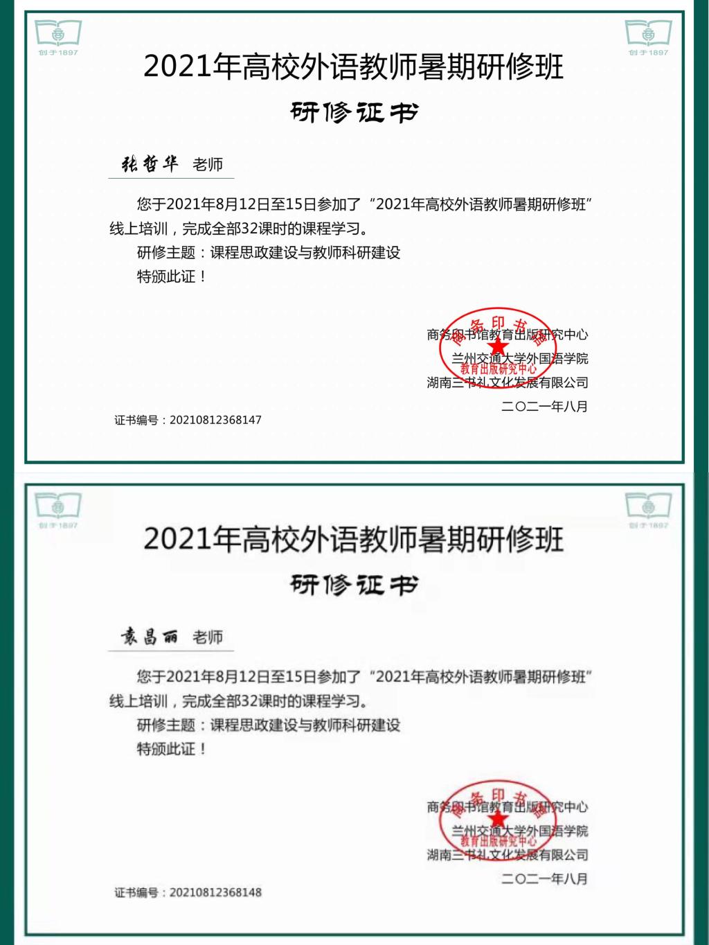 本次研修采取在线学习的形式,免费向广大外语教师开放,内容丰富,视角多元,从理论到实践探解读新时期大学外语教育内涵。我院教师通过学习,对新形势下的外语教育有了更深刻的理解,对课程思政建设、教师科研建设和教育技术应用等方面也有了更深入的认识。最后,我院教师在规定时间内完成课程学习并顺利结业。