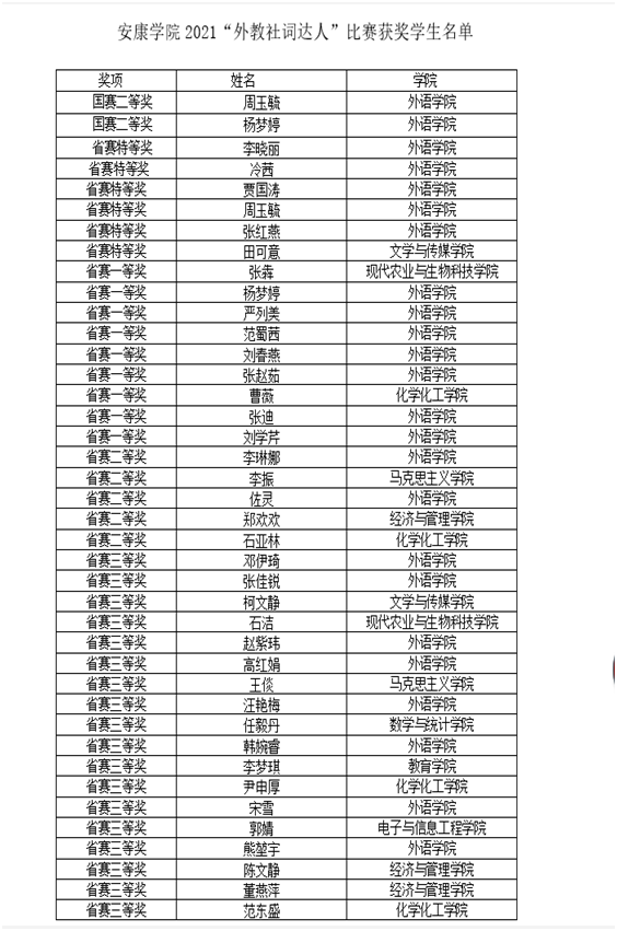 近日,2021年“外教社·词达人杯”大学生英语词汇大赛全国决赛和陕西省赛成绩揭晓。365完美学生周玉毓、杨梦婷获得国赛二等奖;李晓丽等六名同学获得省赛特等奖,张犇等九名同学获得省赛一等奖,李琳娜等五名同学获得省赛二等奖,邓伊琦等十八名同学获得省赛三等奖。