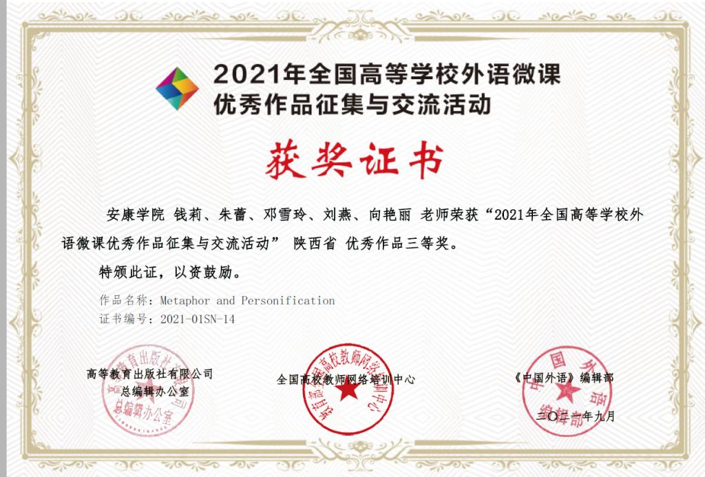 近日,由高教出版社、全国高校教师网络培训中心举办的“2021年外语微课优秀作品征集与交流活动”历经3个月的作品征集、专家评审及公示,公布了优秀作品名单,365完美365完美体育大学英语教学团队(成员:钱莉、朱蕾、邓雪玲、刘燕、向艳丽)提交的微课作品(Metaphor and Personification)荣获陕西省优秀作品三等奖。