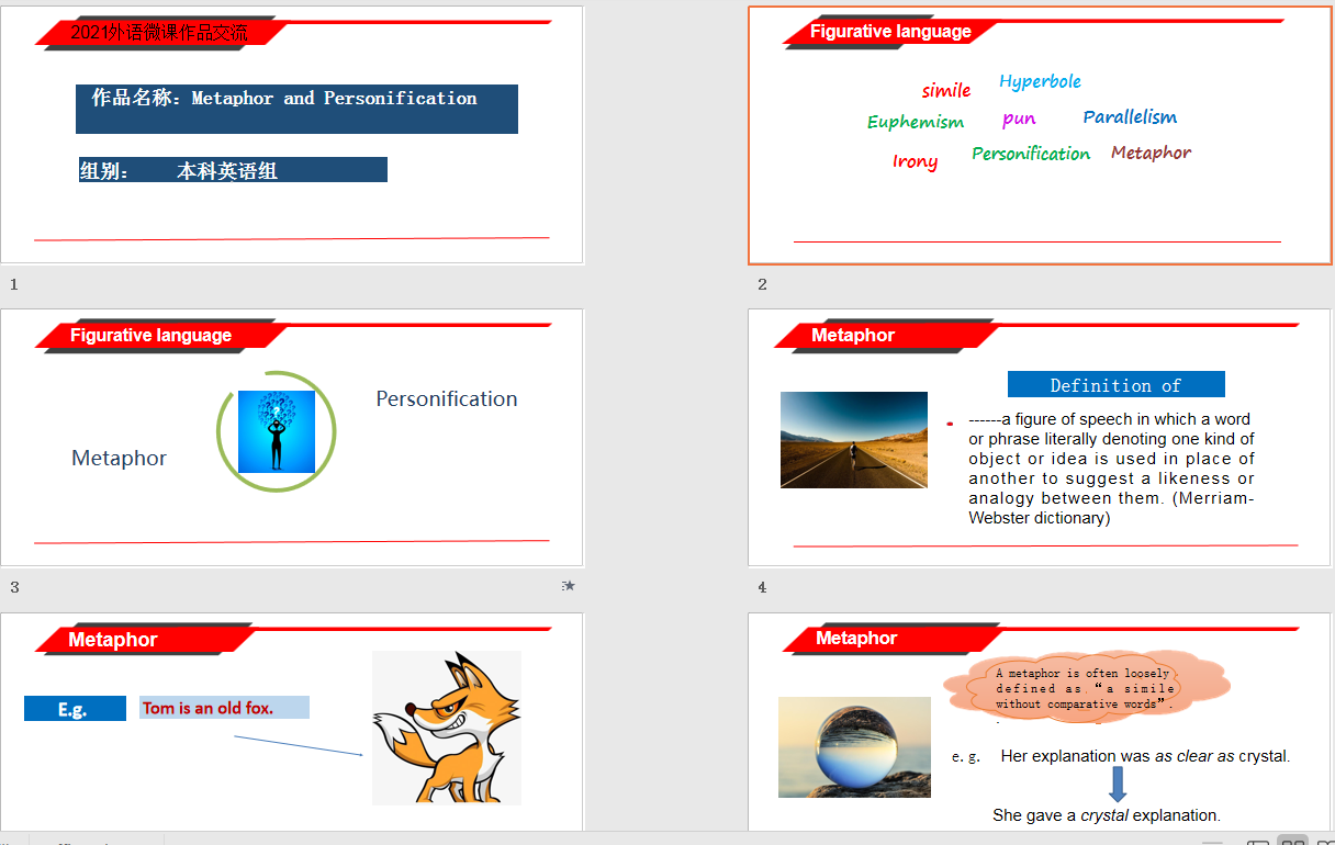 本次全国高等学校外语微课优秀作品征集与交流活动旨在落实立德树人根本任务,助力教育高质量、内涵式发展,构建高水平教师教育体系,加快推进外语教学信息化高质量发展以及在疫情常态化的新形势下线上线下教学的深度融合。我院大学英语教学团队秉持严谨、求实、创新的教学精神,精心设计微课内容,微课作品以学生普遍存在的两种修辞格混淆的问题为切入点,引导学生理解暗喻和拟人两种修辞格的异同,促进学生阅读和赏析能力。微课作品经过反复打磨,最终获得佳绩。