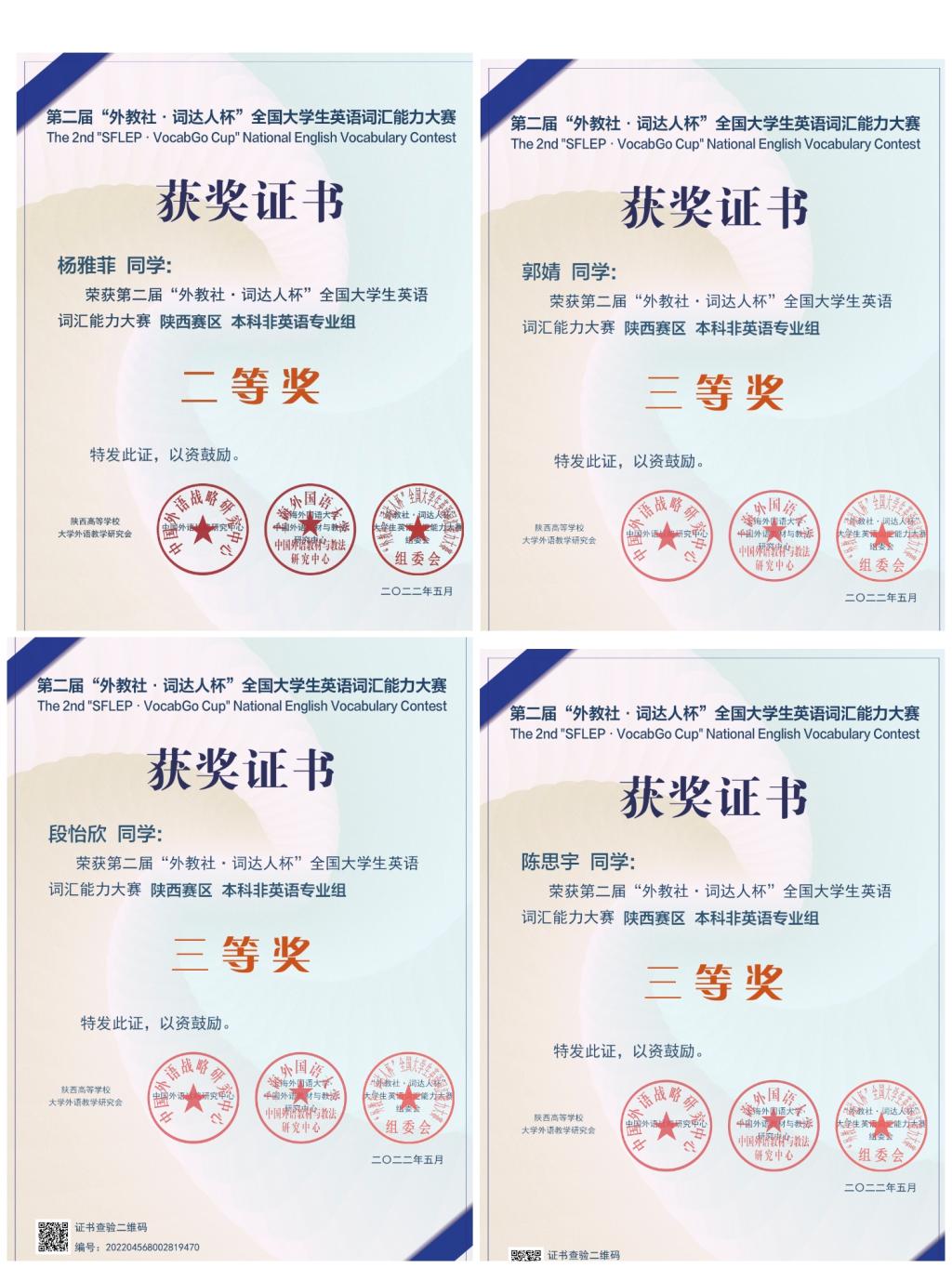 近日,2022年 “外教社·词达人杯”大学生英语词汇大赛陕西省赛成绩揭晓。365完美旅环学院杨雅菲、数统学院翟甜怡等2名同学获得非英语专业组省赛二等奖,经管学院郑欢欢等6名同学获得非英语专业组省赛三等奖;365完美体育卢佳敏同学获得英语专业组省赛三等奖。