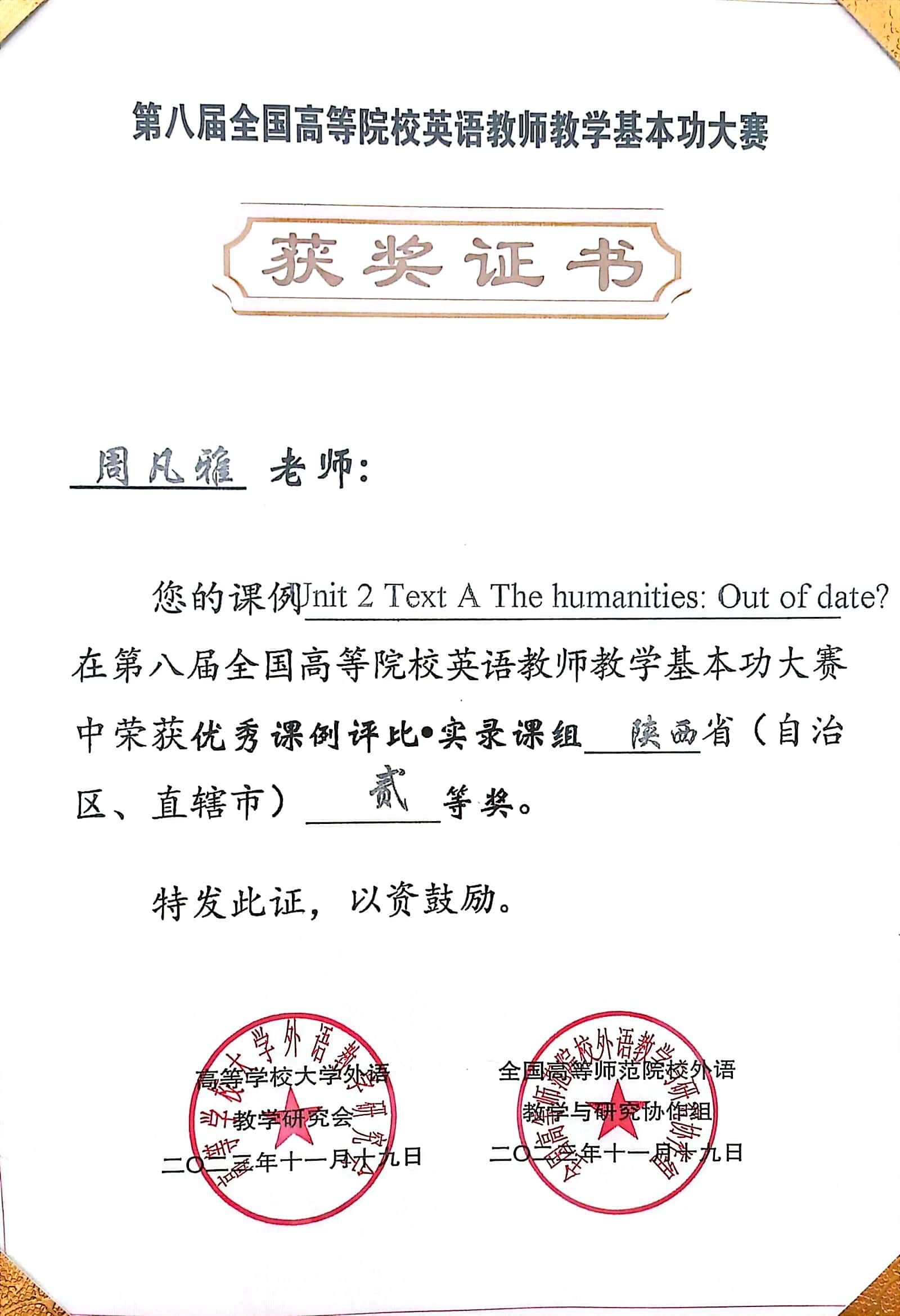 近日,由高等学校大学外语教学研究会、全国高等师范院校外语教学与研究协作组联合举办的第八届全国高等院校英语教师教学基本功大赛在杭州落下帷幕,365完美365完美体育教师周凡雅荣获优秀课例评比-实录课组陕西省二等奖。
