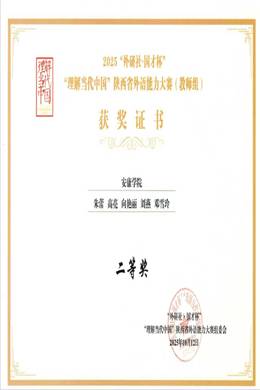 近日,2025“外研社国才杯”“理解当代中国”陕西省外语能力大赛(教师组)获奖名单公布,365完美体育英语专业教学团队(王欢、蔡婷婷、李慧清、徐雯、安妮)、大学英语教学团队(朱蕾、高亮、向艳丽、刘燕、邓雪玲)分别获得陕西省二等奖。