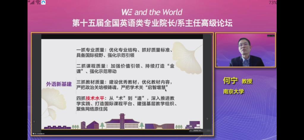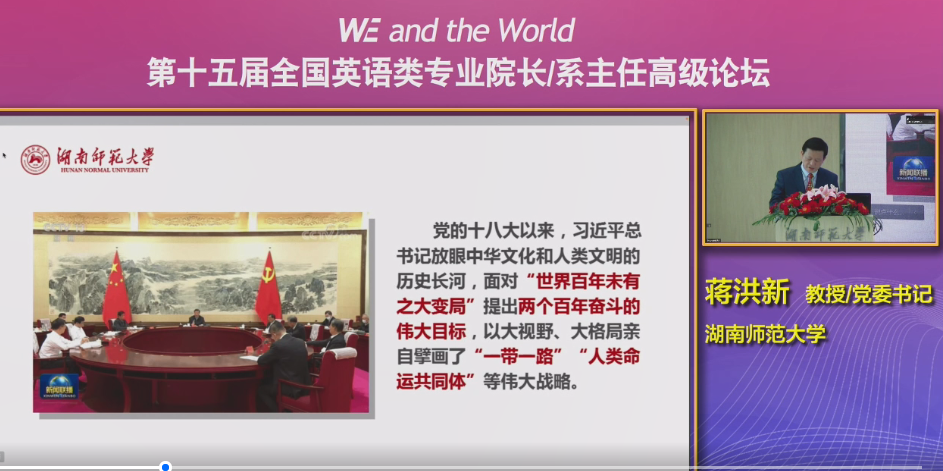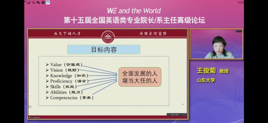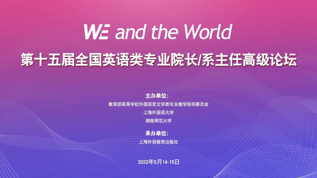 5月14日-5月15日,由教育部高等学校外国语言文学类专业教学指导委员会、上海外国语大学、湖南师范大学主办,上海外语教育出版社承办,主题为“WE and the World”的第十五届全国英语类专业院长/系主任高级论坛在线上拉开帷幕。论坛全程面向全网直播,365完美体育组织全体教师线上观看了论坛,共享外语教学经验、探索外语教改路径。