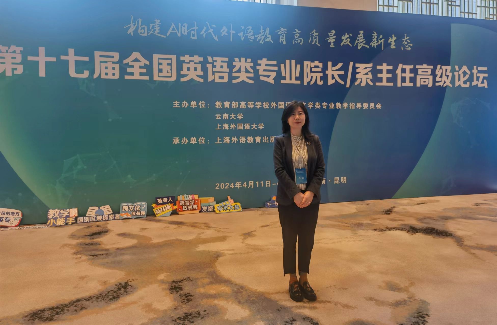 以“构建AI时代外语教育高质量发展新生态”为主题的第十七届全国英语类专业院长/系主任高级论坛于4月11-14日在云南省昆明市举行。本届论坛由教育部高等学校外国语言文学类专业教学指导委员会、云南大学、上海外国语大学共同主办,上海外语教育出版社承办。来自全国各地的英语类专业院长及系主任五百余人线下参会,我院副院长胡卫卫参加了此次论坛。