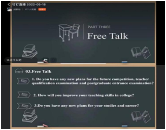伴随着积极热烈的线上气氛,活动进入到了第三阶段free talk环节。同学们畅所欲言、各抒己见,认真探讨了关于如何考取教师资格证,如何以赛促学提高个人的教学能力等话题。