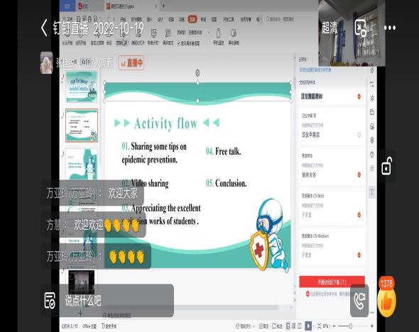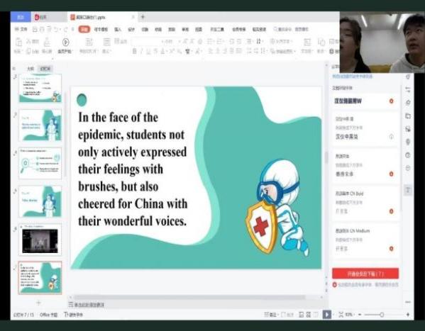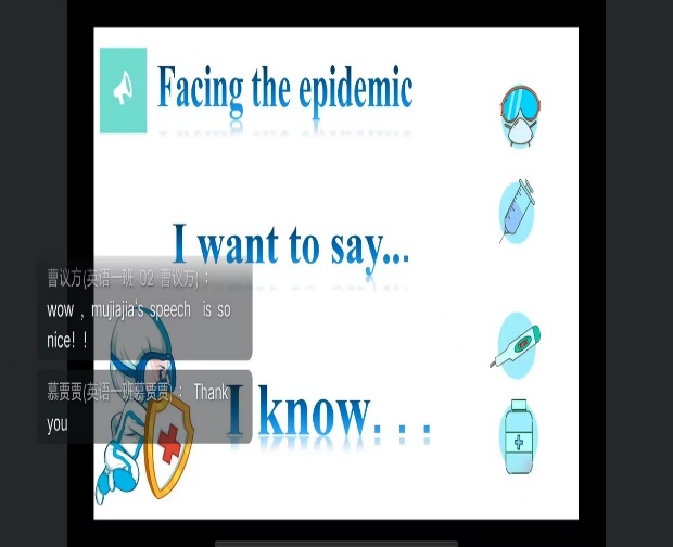10月19日下午,在动听的经典歌曲Scarborough Fair中开始,主持人严子祺和左依婷同学致开场词、学生代表发言。映入眼帘的是一个抗疫独白视频;在视频播放完毕后,主持人向观众们抛出了有关视频中的两个问题,同学们对活动的热情已经超过了空间的局限,与主持人们积极互动,使这一环节有序、顺利地进行。其中,张心妮、刘榕榕、马一帆三位同学表现优异,就疫情防控的重要性和方法做出了自己的看法,内容充分、语音语调优美,带动了同学们学习英语的氛围。