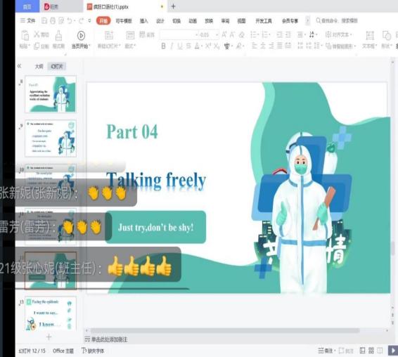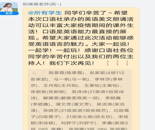 最后,伴随着同学们积极热烈的线上讨论,本次线上活动也顺利地接近了尾声。虽然由于疫情原因拉远了大家的空间距离,但是却并没有削弱大家的语言学习实践的积极性,此次英语美文朗诵比赛为学生们提升语言能力、展示个人风采提供了平台,鼓励他们积极提升英语口语,增强专业知识,体会语言的魅力。