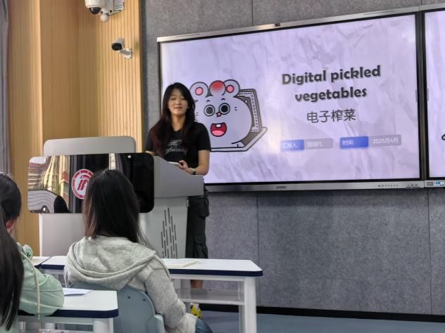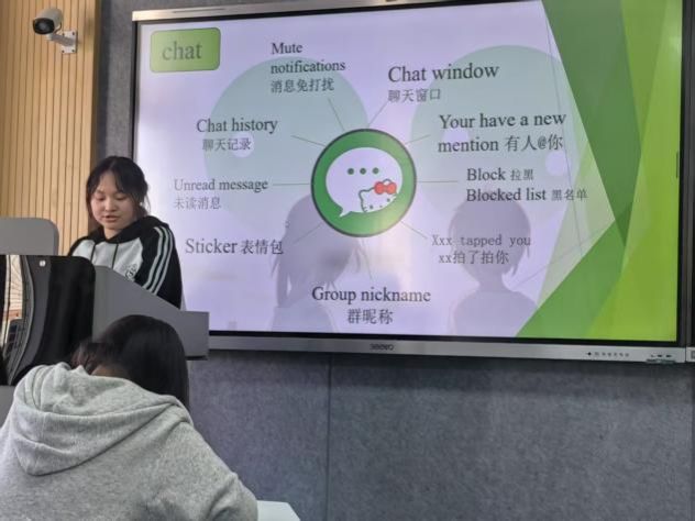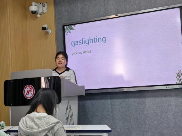 随后的讲解中中,王心妮同学通过"全球青年着装风格对比"的趣味展示,带领观众感受服饰文化背后的语言符号;董昱彤同学则聚焦情感话题,以"Crush(心动)”、“Situationship(暧昧关系)”等网络热词为线索,结合“ gaslighting(煤气灯效应)”理论深度剖析情感PUA现象,并以“Stimp(舔狗)”为案例,呼吁同学们保持理性情感观。郑琪凡同学以“Digital Pickled Vegetables(电子榨菜)”这一网络新词为切入点,幽默揭示当代青年"碎片化学习+娱乐"的生活状态;从流行文化透视语言生命力活动后半程聚焦网络热词的文化穿透力。除此之外,还有关于“Abstract Culture(抽象文化梗)”、“Blind Box Economy(盲盒经济)”、“We Chat”等流行的网络热词。