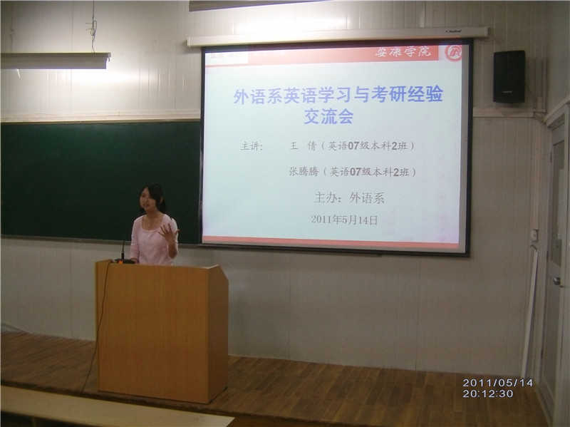 为了给同学们搭建更加良好的英语学习与考研交流平台,更加充分利用优秀毕业生资源,使08级、09级同学设定更实际的学习目标,更明确努力的方向,找到有效地学习方法,由外语系主办的首场英语专业学习与考研经验交流会,于5月14日晚在6408教室成功举办。外语系英语专业的近百名同学参加了此次交流会。